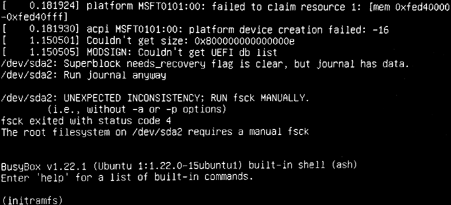 "The root filesystem on /dev/sdaX needs a manual fsck"
