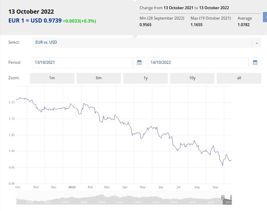 Os dejamos una imagen del gráfico que muestra, en el periodo de un año, la trayectoria a la baja de la moneda europea respecto al dólar.