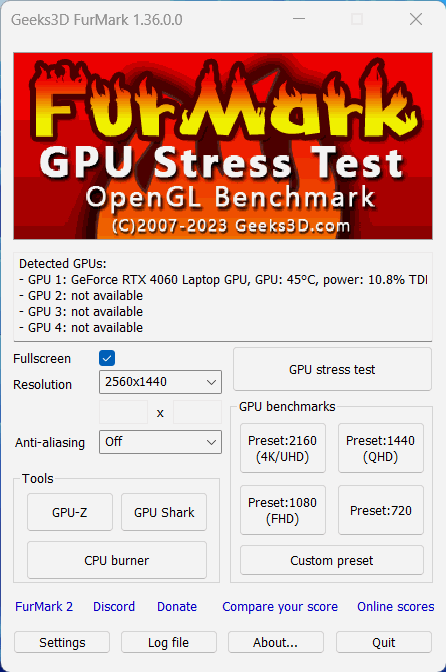 Podemos simplemente ejecutar GPU stress test, esto hará que la gráfica este trabajando constantemente sin tiempo ilimitado. Y en el apartado de GPU benchmarks, elijemos un preset, y el benchmark dura aprox. 1 minuto.