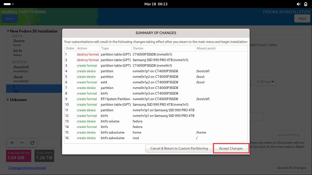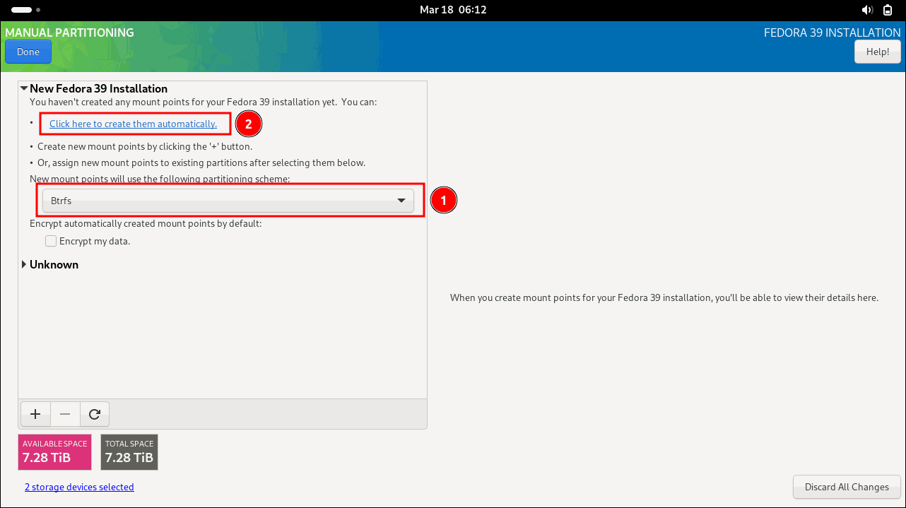 Para el esquema de particiones, vamos a elegir que se creen automáticamente en formato BTRFS, si lo deseas, puedes cambiar esto a tu necesidad.