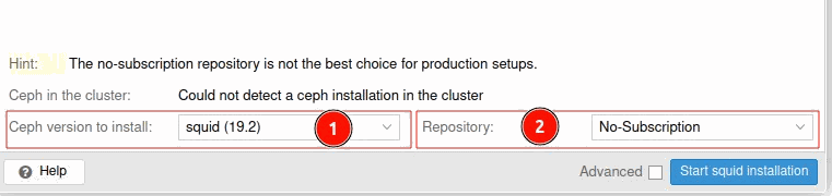 ## En la ventana "Info", cambiamos la versión de instalación Ceph a "squid (19.2)" y el tipo de repositorio "No-Subscription"