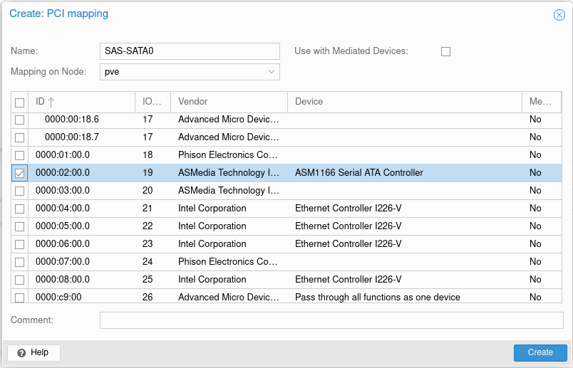 Primera entrada: Podéis asignar el nombre que queráis, nosotros hemos asignado SAS-SATA0 y buscamos la entrada ASMedia Technology con ID:0000:02:00.0” y Create