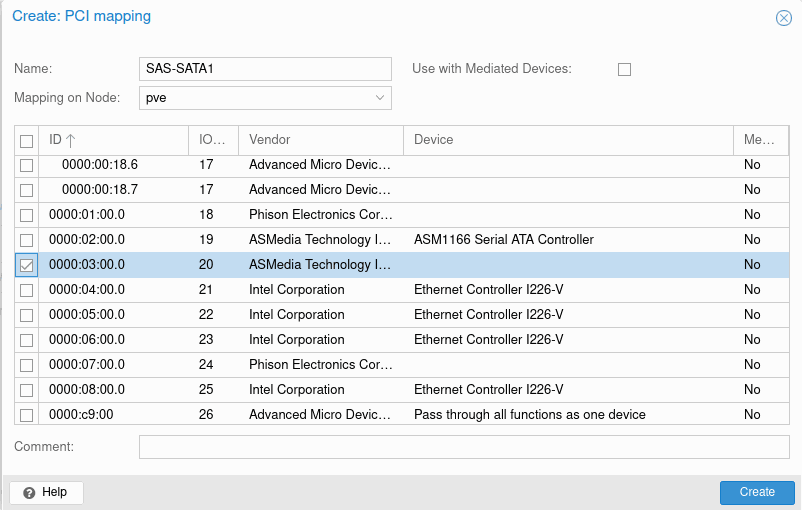 Segunda entrada: Podéis asignar el nombre que queráis, nosotros hemos asignado SAS-SATA1 y buscamos la entrada ASMedia Technology con ID:0000:03:00.0” y Create