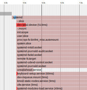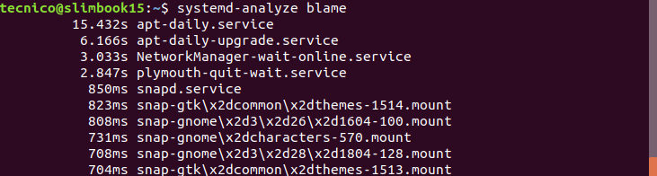 Si queremos mas detalles y ver los servicios uno a uno, vamos a utilizar el parámetro blame: systemd-analyze blame