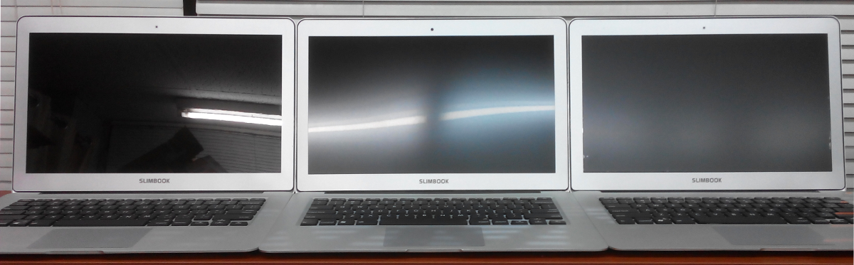 Aquí podéis ver 3 ejemplos (pantalla brillo, pantalla mate y pantalla con "Anti-Glare Matte Skin" con un reflejo directo de una luz blanca. En todas ellas se reflejan la misma tira de tubos: