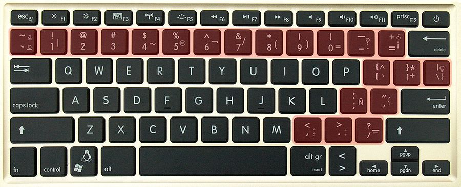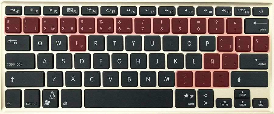 Las zonas "subrayadas" en rojo, son las teclas que cambian de un teclado a otro, el resto son iguales.