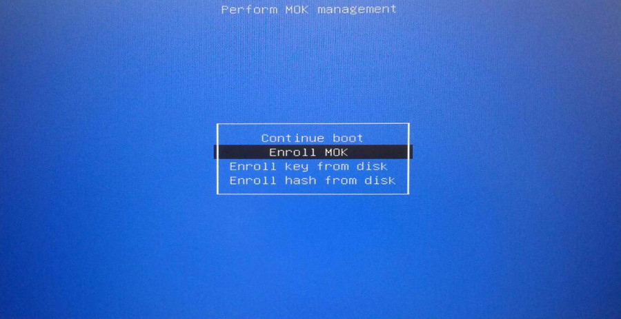 Cuando estemos dentro de la pantalla azul seleccionamos Eroll MOK > Continue > y nos pedirá la contraseña que hemos introducido anteriormente, la introducimos y se nos informara que se ha completado la operación con éxito.