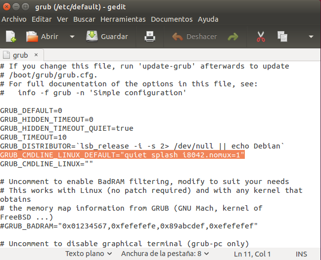 1- Deberemos editar un archivo del grub para añadir esta linea: i8042.nomux=1. Para ello escribimos el siguiente comando: