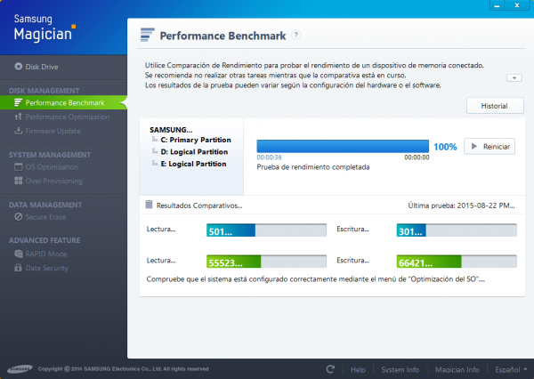 Si ejecutamos el test de Samsung, vemos que la tasa de lectura son 501 MB: