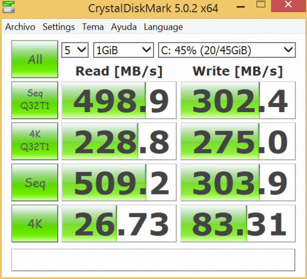 En la siguiente captura, ejecutada en Windows, podemos ver las elevadas tasas de escritura de 1GB en acceso secuencial, aleatorio, y con algoritmos: