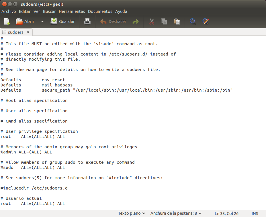 Importante loguearse con permisos para acceder al fichero. Como en el proceso anterior, se nos abrirá el fichero de sudoers.