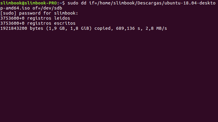 sudo dd if=/home/user/Descargas/ubuntu-18.04.iso |pv|dd of=/dev/sdb bs=1M |