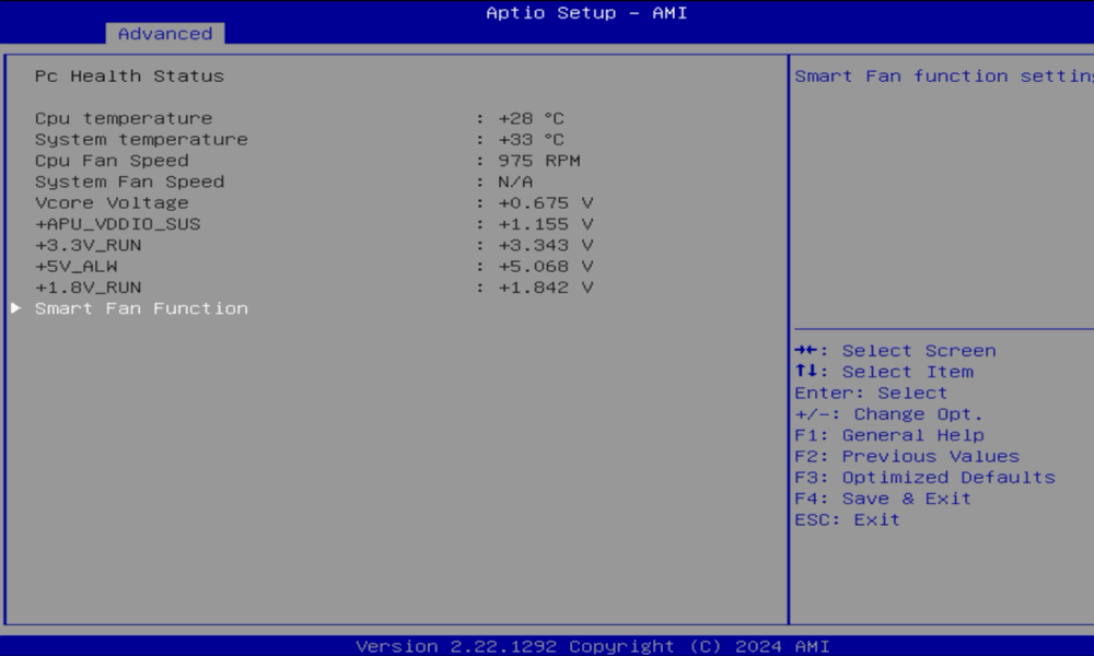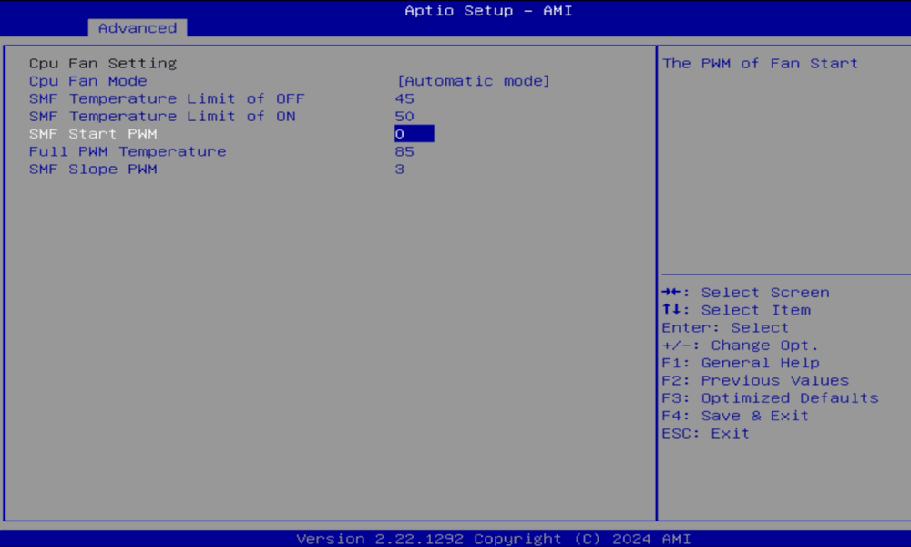 Una vez estemos dentro iremos a Advanced -> Hardware monitor -> Smart Fan Function -> CPU Fan Setting -> SMF Start PWM -> lo ponemos de 105 a 0