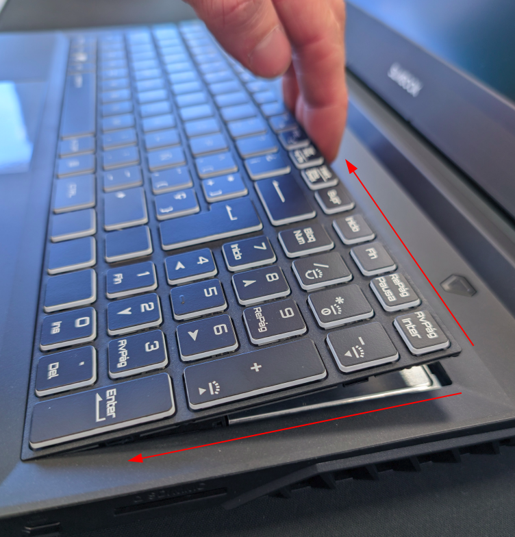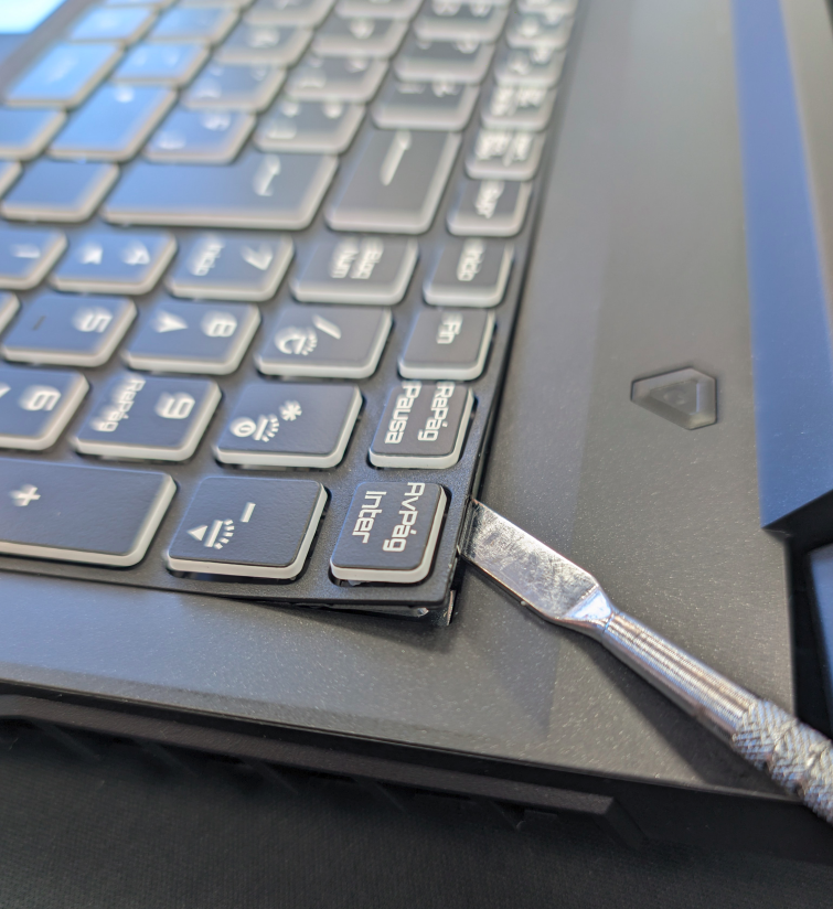 2. Luego, debes retirar el teclado. Para ello, puedes usar un cuchillo o algo lo suficientemente afilado que pueda caber entre el chasis y el módulo del teclado y levantar cuidadosamente las pestañas de anclaje como se muestra en la imagen.
