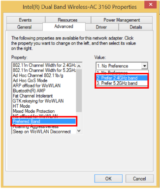 6- Ahora debemos de cambiar la banda preferida de la tarjeta wifi, para ello seleccionamos la propiedad banda preferida y cambiamos su valor a "Prefer 2.4Ghz band".