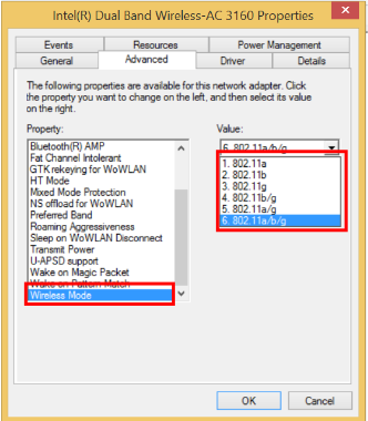 5- Ahora buscamos la propiedad "Modo Wifi" y cambiamos el valor a "802.11a/b/g" (Debes de elegir el valor que se ajuste a las características de tu router).