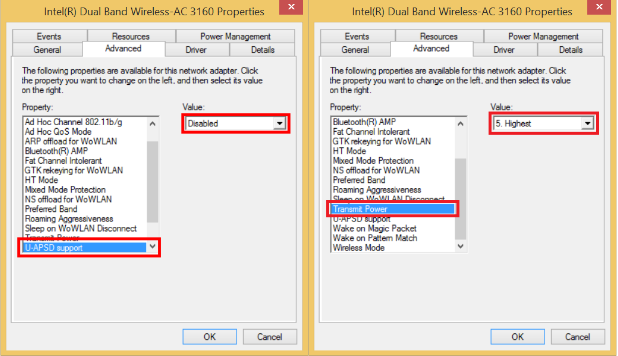 4- Seleccionamos la pestaña "Avanzado", seleccionamos la propiedad "U-APSD support" y cambiamos el valor de la derecha a Disabled. Luego comprobamos que la propiedad Potencia de transmisión tenga el valor más alto, si no lo tiene lo ponemos.