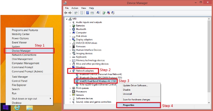 3- Después nos dirigimos a "Administrador de dispositivos" haciendo click derecho en el icono de Windows y seleccionando Administrador de dispositivos. En la siguiente ventana desplegamos los adaptadores de red, hacemos click derecho sobre la tarjeta wifi y seleccionamos propiedades.