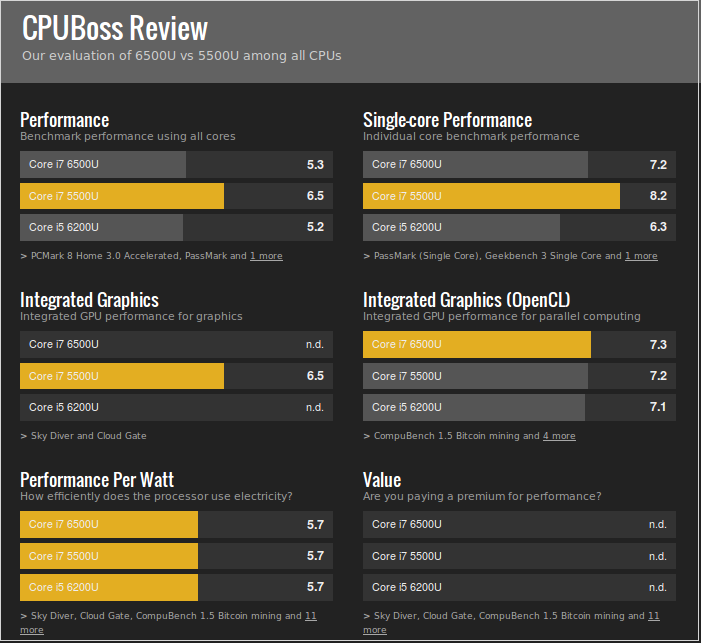 A continuación vamos a hacer una comparativa desde CPUBoss entre un Intel Core i7 5500U y un Intel Core i7 6500U, de quinta y sexta generación, respectivamente. Se evaluarán el individual de un «core», los gráficos integrados y la eficiencia por vatio: