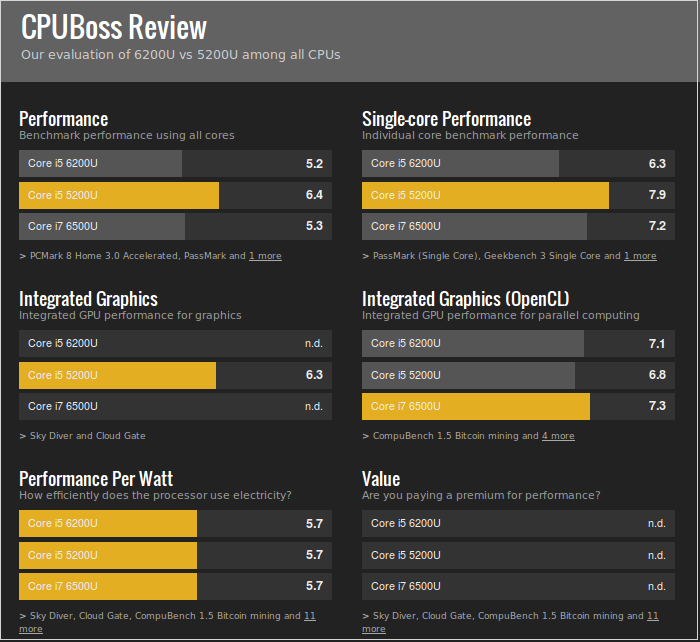 Aquí compararemos los procesadores Intel Core i5 6200U e Intel Core i5 5200U, también usando la comparativa de CPUBoss. Como en el caso anterior, se contrastarán el individual de un «core», los gráficos integrados y la eficiencia por vatio de ambos procesadores: