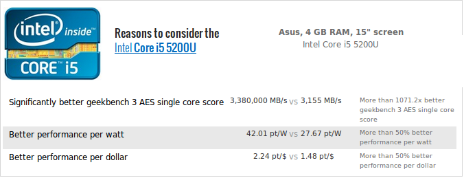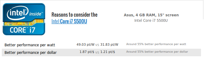 Ya como conclusión, veremos que el Intel Core i7 5500U da mejor resultado en cuanto a rendimiento/precio, llegando a ser un 55% mejor en rendimiento por vatio y por dolar: