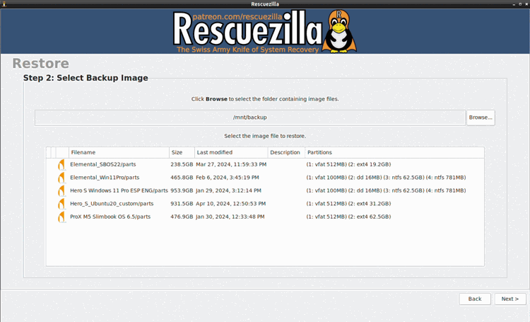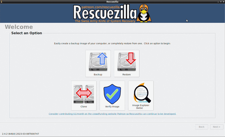 Rescuezilla es la interfaz gráfica de usuario (GUI) de la famosa Clonezilla. Es un derivado de Redo Backup and Recovery (ahora llamado Redo Rescue) el cual había sido abandonado durante 7 años. Ha sido reconstruido cuidadosamente desde cero para ser totalmente compatible con el estándar de la industria Clonezilla.