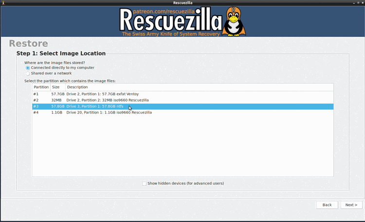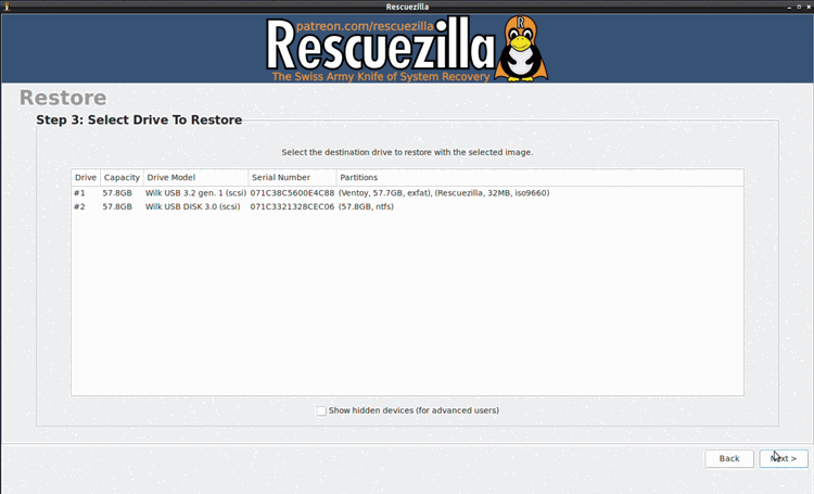 3. Rescuezilla te mostrará una lista de dispositivos de almacenamientos disponibles. Selecciona el USB donde tengas la imagen descomprimida que deseas restaurar. En nuestro caso seleccionamos el USB de 64GB (57.8GB usables) y le damos a Next.