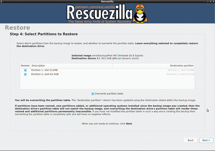 6. Una vez que hayas seleccionado la ubicación de destino, confirma tus selecciones y espera a que Rescuezilla restaure el respaldo. Dependiendo del tamaño de tu respaldo y la velocidad del dispositivo de almacenamiento, esto puede llevar algún tiempo.