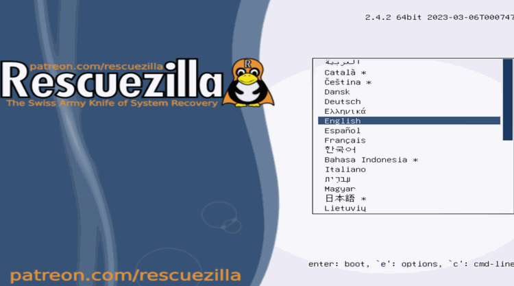 1. Conecta el USB con Rescuezilla a tu Slimbook. Para acceder al menú de arranque tienes que pulsar repetidamente F7 o F10 cuando está arrancando y elige el USB de arranque Rescuezilla. Elige el idioma.