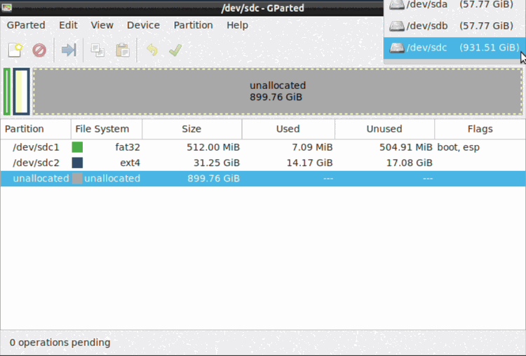9. Seleccionamos el disco donde hemos restaurado la imagen haciendo click arriba a la derecha de la ventana, en nuestro caso es /dev/sdc (931.51GB) el tuyo puede ser distinto con otro tamaño.