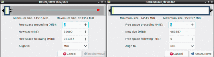 10. Una vez seleccionado el disco nos saldrá esta ventana, tendremos que elegir la partición donde tiene almacenado los datos y redimensionarlo para que quepa en todo el disco. Click derecho en la partición ext4 y elegimos la opción Resize/Move