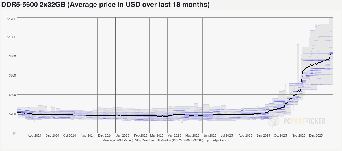 Sigue aumentando el precio de las memorias RAM DDR5 5600, especialmente en kits de 2×32 GB. Los datos más recientes muestran que la tendencia alcista continúa, reflejando la presión en la cadena de suministro y la creciente demanda de módulos de alta velocidad para PCs de última generación.
