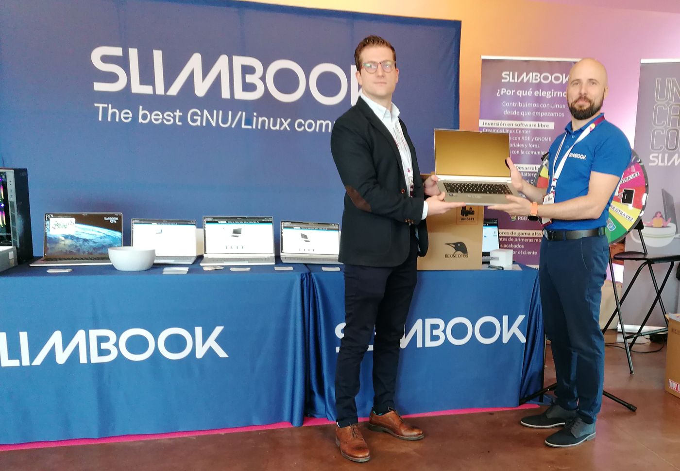 Realmente satisfactorio ver como los asistentes se acercaban para conocernos o porque ya nos conocían y tenían sus propios Slimbook en el trabajo o en casa. Nos llevamos con nosotros la, ya conocida, Ruleta de Slimbook :) Llena de premios y merchandising que repartimos durante los dos días del evento.