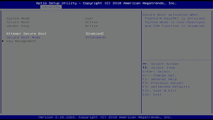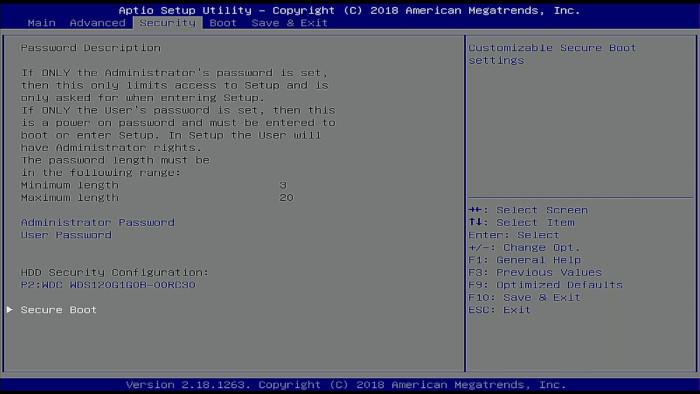 Para activar/desactivar el Secure Boot iremos hacia la pestaña "Security" usando las flechas, dentro de Security seleccionaremos "Secure Boot".