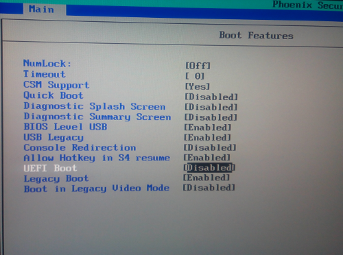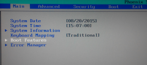 2- Entramos en la BIOS (imagen de abajo), nos situamos en la pestaña 'Main' y nos desplazamos hacia abajo mediante las flechas direccionales del teclado seleccionando la opción "Boot Features", le damos a 'Intro'.