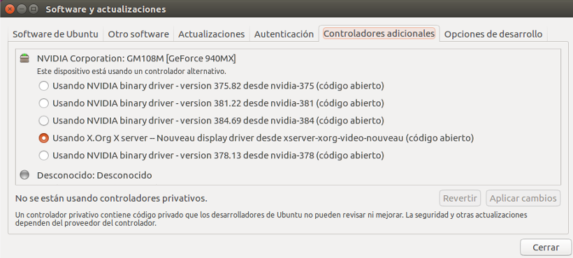 Una vez hecho, puedes comprobar y cambiar el driver de NVIDIA que estemos usando en "Controladores Adicionales" de la configuración del sistema.