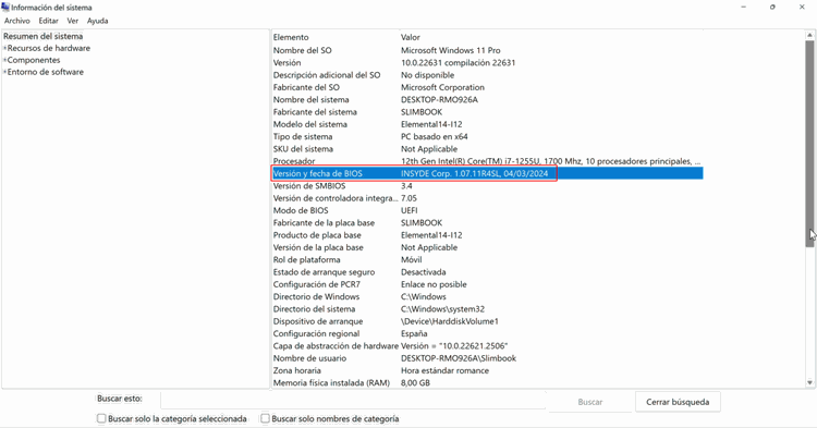 1. System information: Buscamos Información del sistema y aquí nos aparecerá la versión de la BIOS: