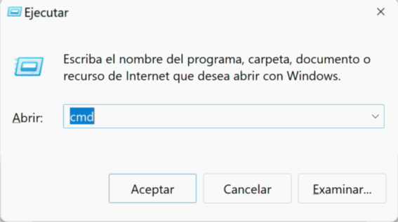 - Con Windows + R abrimos el cuadro de Ejecutar y ponemos cmd