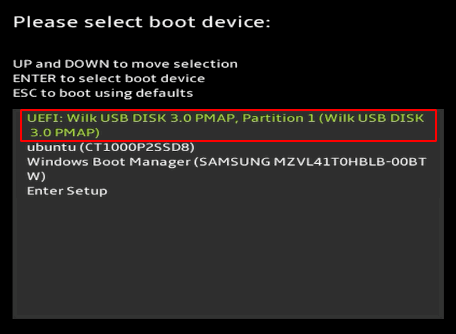 2. Presiona el botón de encendido y luego pulsa F7 o (F10 en algunos modelos) repetidas veces hasta que aparezca la pantalla de selección del USB de almacenamiento. Elige tu USB y presiona Intro.