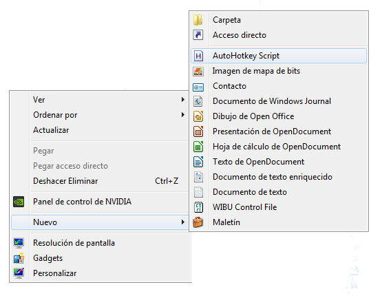 1- Para crear un nuevo script, hacer un clic derecha en el Escritorio, encontrar "nuevo" y pulsar en AutoHotKey Script.