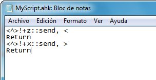 4- Entrar su codigo, este es un ejemplo para acceder a las teclas < y > haciendo AltGr+Shift+Z para < y AltGr+Shift+X para >