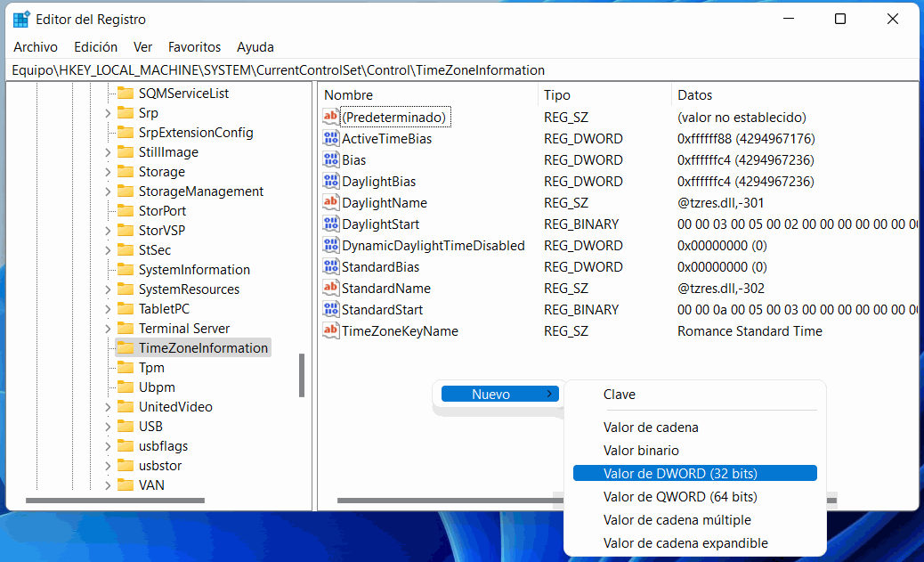 Veremos que se nos ha creado una entrada Nuevo valor #1 en el registro. Seleccionamos la entrada y pulsamos F2 para editar. Cambiamos el nombre a RealTimeIsUniversal .