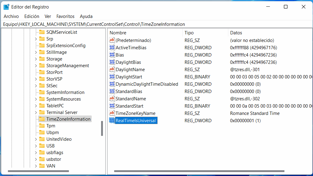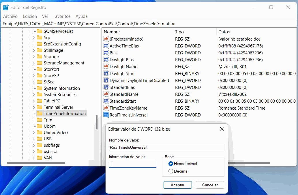 **Para restablecer los cambios tenemos que modificar el valor de la entrada RealTimeIsUniversal. Si el valor de la entrada es 0, Windows volverá a trabajar con la hora local.**