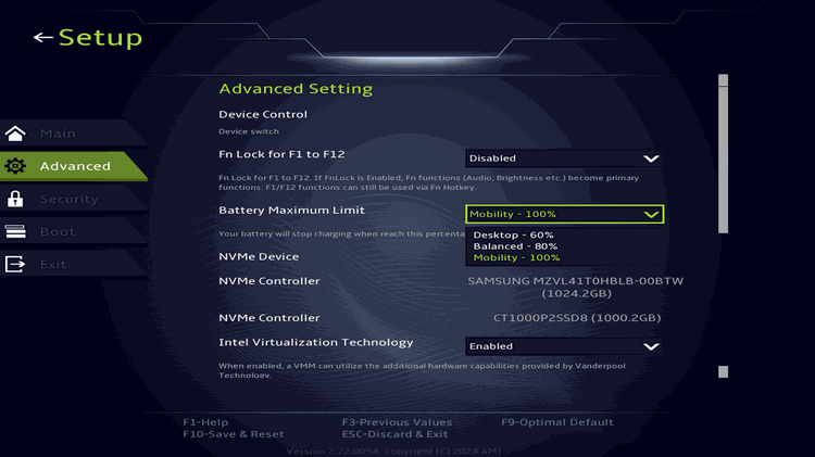 1. Activa la limitación de carga por BIOS: Algunos de nuestros portátiles tienen la función de limitación de carga por BIOS al 60-80%, dado que usar el portátil siempre con el cargador puesto al 100% de carga puede deteriorar la batería con el tiempo. Si tu Slimbook está conectado a una fuente de alimentación, la batería se alimenta de esa fuente incluso si está instalada.
