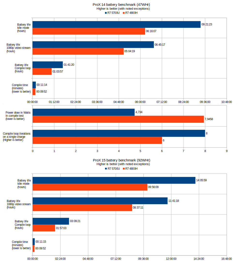 En primer lugar, la versión del portátil de 14 pulgadas, que tiene una batería inferior a la de 15, ha logrado estirar su duración hasta 3 horas más en modo IDLE y hasta 1:40 más en reproducción de vídeo streaming 1080. En este aspecto, la versión de 15 pulgadas nos da 4 horas más en modo IDLE y 3 horas más en reproducción de vídeo.