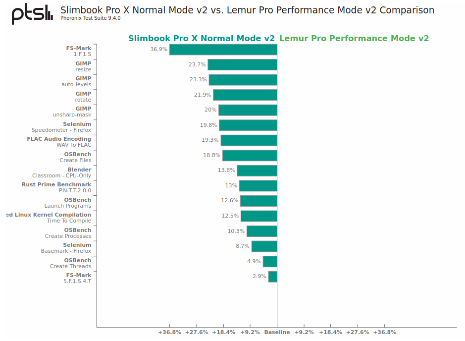 Hoy, 7 de junio, Jason Evangelho ha realizado los mismo benchmarks frente al InfinityBook de Tuxedo, y los resultados no han ido mucho mejor para este competidor, que tan sólo en 2 de las pruebas ha superado al Slimbook, con valores del 3.5 y 4.5%, pero ha perdido en las otras 14 pruebas, siendo superado por nuestro ordenador de un 13.8% a un aplastante 102%. Puedes ver el resumen en esta imagen o hacer clic para ver el benchmark completo: